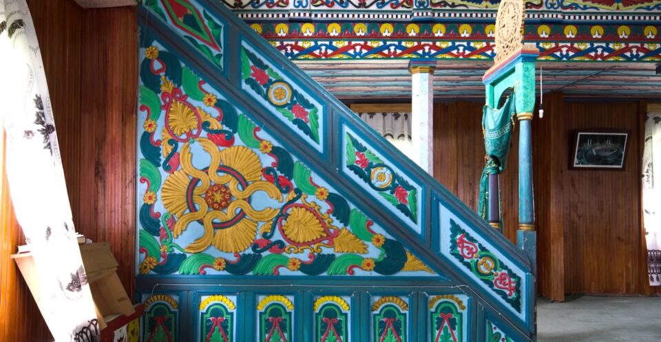 Historical mosque built 150 years ago. It is interestingly decorated with ornaments and religious symbols. This is an outstanding example of Georgian carpentry.